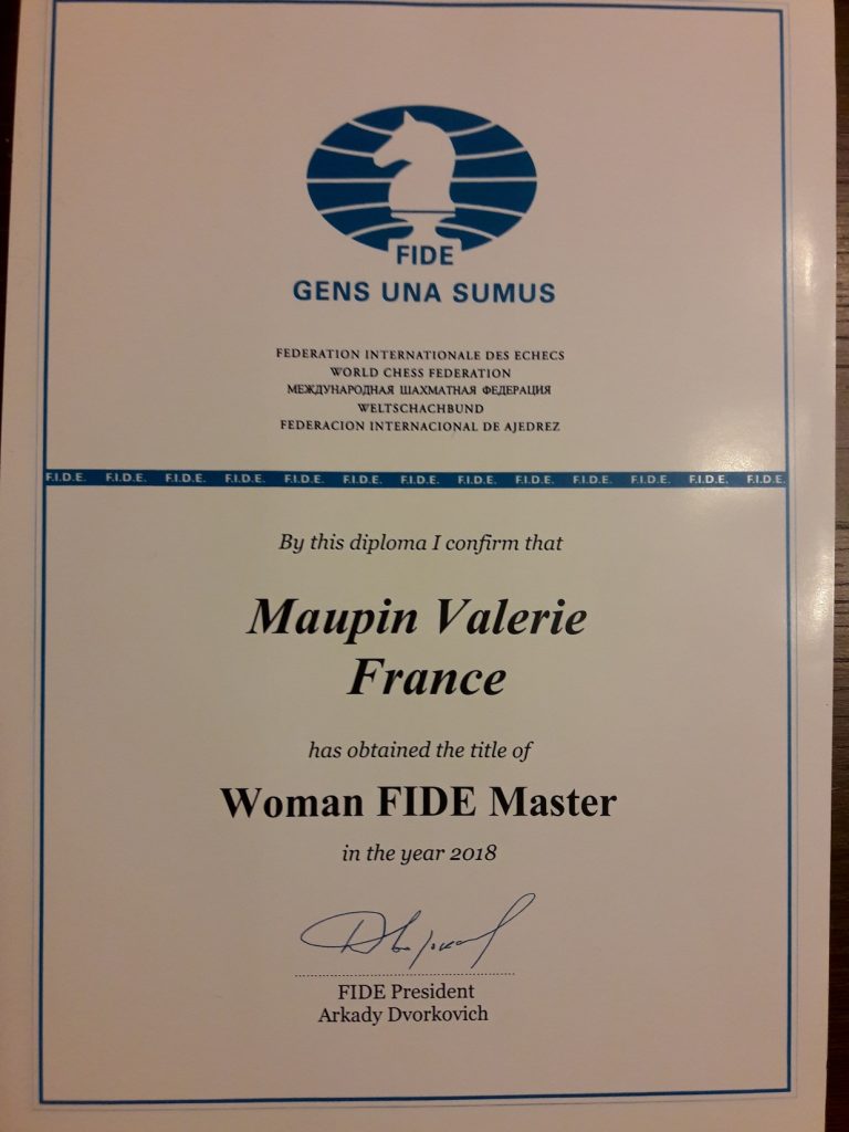 Félicitations à Valérie Maupin qui obtient le titre de Maître FIDE féminin ! Nous lui souhaitons beaucoup de succès pour la suite de son parcours vers les plus hauts sommets internationaux.