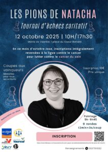 Pour ceux qui ne savent pas quoi faire ce Dimanche. Un tournoi Rapide à Vauréal dans le cadre d’octobre Rose , le club de Vauréal organise « les pions de Natacha », la totalité des inscriptions sera reversée à la ligue contre le cancer du sein.