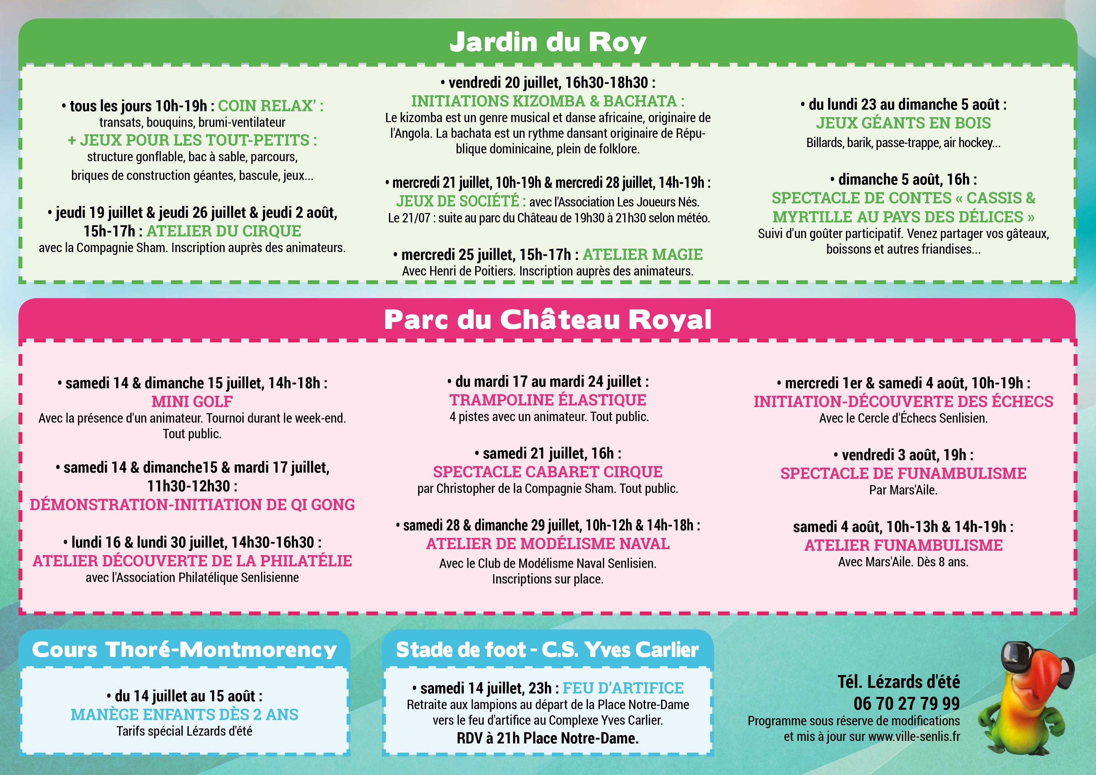 En ce moment et jusqu’au 5 août se déroulent les « Lézards d’été » à Senlis, dans le magnifique cadre du parc du château royal. On y trouve des jeux pour les petits, des spectacles, des ateliers, bref de quoi s’amuser lors de votre visite.