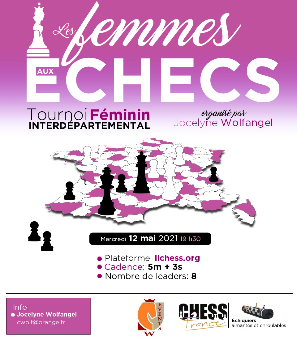 Mercredi 12 mai à 19h30, Jocelyne Wolfangel organise un tournoi de blitz féminin interdépartemental sur la plate-forme Lichess.
