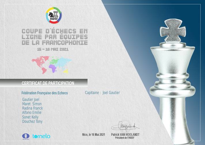 Pour ma part, j’étais particulièrement heureux de jouer aux côtés d’Emilie Alfano, championne de France U10F. J’avais vu une interview de cette dernière lorsqu’elle avait été invitée sur France 3 (passage à 26 min 18 s). Je crois que Joël essayait de mettre tout le monde à l’aise tout en rappelant l’importance de s’appliquer et d’être sérieux. « Ce n’est pas un championnat du monde mais éviter de jouer la Grob ». Simon et Tony avaient déjà l’expérience de la compétition en ligne et participé aux championnats de France jeunes. Joël nous signala que tout le monde jouerait quoiqu’il arrive (6 sélectionnés dont 2 féminines).